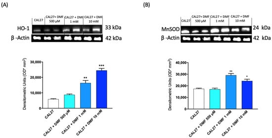Effect of DMF on HO-1 and MnSOD expression in CAL27 cells. The blots revealed a significant increase of HO-1 expression following DMF treatment at the concentration of 1 mM and 10 mM (A). DMF at the same doses was also able to significant increase the expression of MnSOD (B). (A,B) * p < 0,05 vs. CAL27; ** p < 0.01 vs. CAL27; *** p < 0.001 vs. CAL27.