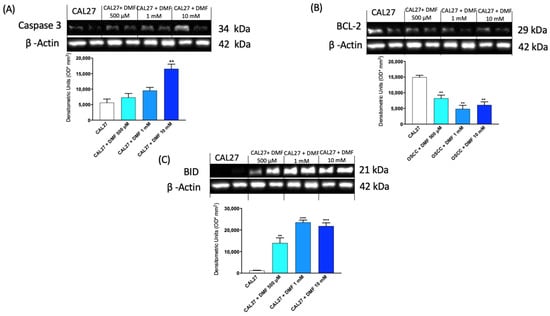 Effect of DMF on Caspase3, BID and BCL-2 expression in CAL27 cells (A–C). The blots revealed an increase of pro-apoptotic Caspase-3 and BID expression and a decrease of anti-apoptotic BCL-2 expression following DMF treatment at concentrations of 500 μM, 1 mM and 10 mM compared to CAL27 group. Data are representative of at least three independent experiments. (A,B) ** p < 0.01 vs. CAL27; (C) ** p < 0.01 vs. CAL27; *** p < 0.001 vs. CAL27.