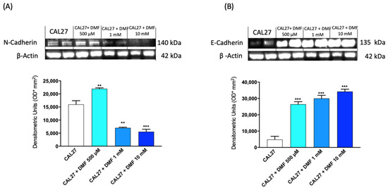 Effect of DMF on N-Cadherin and E-Cadherin expression in CAL27 cells. The blots revealed a significant decrease of N-Cadherin expression following DMF treatment at the concentration of 1 mM and 10 mM (A). DMF was also able to significant increase the expression of E-Cadherin at the concentration of 500 μM, 1 mM and 10 mM (B). (A,B) ** p < 0.01 vs. CAL27, *** p < 0.001 vs. CAL27.