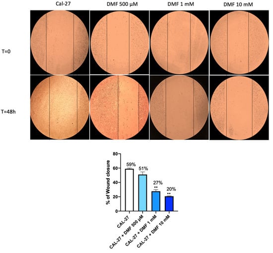 Effect of DMF on CAL27 migration. The wound healing assay (scratch test) revealed a significant reduction in the number of cells migrating to the scratched area, following 48 h of DMF treatment at the concentration of 1 mM and 10 mM. ** p < 0.01 vs. CAL27.