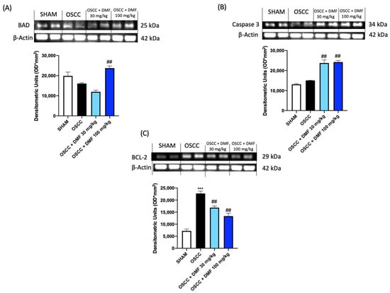 Effect of DMF on Caspase3, BAD and BCL-2 expression in tongue samples (A–C). The blots revealed an increase of pro-apoptotic BAD expression after DMF treatment especially at the dose of 100 mg/kg and Caspase 3 at both doses. A decrease of anti-apoptotic BCL-2 expression followed DMF treatment in a dose dependent manner compared to OSCC group. Data are representative of at least three independent experiments. (A,B) ## p < 0.01 vs. OSCC; (C) *** p < 0.001 vs. SHAM; ## p < 0.01 vs. OSCC.