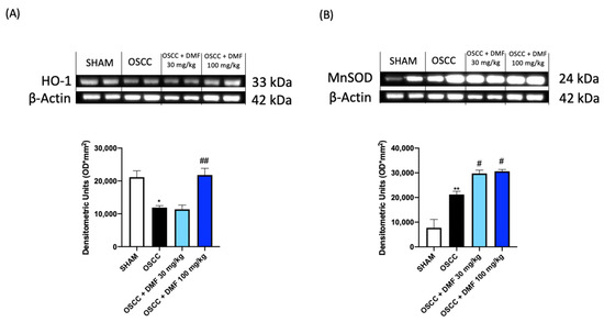 Effect of DMF on HO-1 and MnSOD expression in tongue samples (A,B). The blots revealed a significant increase of antioxidant expression of HO-1 after DMF treatment especially at the dose of 100 mg/kg and MnSOD at both doses. (A) * p < 0.05 vs. SHAM; ## p < 0.01 vs. OSCC; (B) ** p < 0.01 vs. SHAM; # p < 0.05 vs. OSCC.