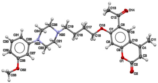 The crystal data and structure refinement parameters for 6-acetyl-7-{4-[4-(3-methoxyphenyl)piperazin-1-yl]butoxy}-4-methylchromen-2-one (2) are collected in Table 1. Compound 2 crystallizes in P21/c space group. The structure of the crystal measured at 130 K is fully ordered, which is visible in Figure 2, displaying the asymmetric unit with anisotropic displacement parameters of all non-H atoms at a 50% probability level.