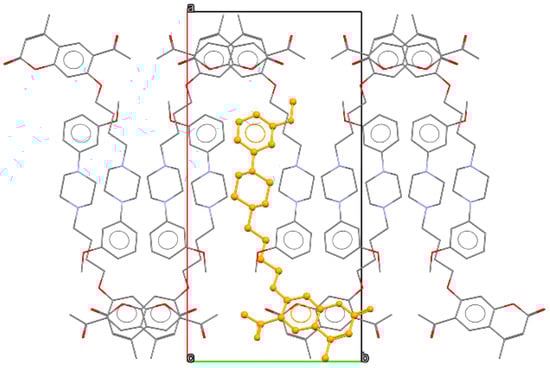 Because of the lack of strong hydrogen bond donors, the structure is supported by weak interactions only. However, such interactions slightly affect the geometry of the coumarin molecules, which deviate somewhat from planarity. The distance between the mean plane fitted to the coumarin C5–C10 atoms and O2 moiety is 0.15 Å. In addition, the acetyl group is slightly rotated with respect to the C5–C10 benzene moiety with the interplanar angle close to 15°. In the crystal lattice, the coumarin fragments are engaged in parallel π-π stacking, with the closest distances between the C5–C10 benzene plane and above/below coumarin moiety C atoms being ca. 3.52 Å. These stacks of moieties are parallel to the [001] direction. The side chains containing the piperazine unit are grouped in the central part of the unit cells, as presented in Figure 3. Here, some weak C H…N interactions (H…N distance of 2.64 Å) involving neighboring piperazine moieties can be observed.