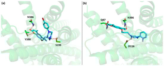 Predicted pose of (a) 7 and (b) experimental pose aripiprazole inside the binding pocket of the 5-HT1A receptor, highlighting the most important interactions between ligands and the receptor (salt bridge between the ligand and D116 and hydrogen bond between the ligand and Q97). Oxygen atoms are shown in red, nitrogen in blue, carbon in cyan or green and hydrogen in light grey.