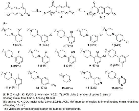 The starting coumarin 6-acetyl-7-hydroxy-4-methylchromen-2-one was resynthesized according to previously published studies []. The planned compounds were obtained in two steps. In the first step, 6-acetyl-7-(4-bromobutoxy)-4-methylchromen-2-one (A) was prepared by alkylation of the phenolic group with dibromobutane in acetonitrile in the presence of potassium iodide and potassium carbonate (Scheme 1). In the second step, the final compounds were obtained according to the previously published study []. Microwave irradiation was used in order to increase yield and to reduce the reaction time. The synthesis of compounds 1–15 was carried out by reacting the 6-acetyl-7-(4-bromobutoxy)-4-methylchromen-2-one (A) with appropriate arylpiperazine: 4-(2-methoxyphenyl)piperazine, 4-(3-methoxyphenyl)piperazine, 4-(2-bromophenyl)piperazine, 4-(3-bromophenyl)piperazine, 4-(4-bromophenyl)piperazine 4-(2-fluorophenyl)piperazine, 4-(2-chlorophenyl)piperazine, 4-(2-cyanophenyl)piperazine, 4-(2,3-dichlorophenyl)piperazine, 4-(3,5-dimethylphenyl)piperazine, 4-(2,5-dime thylphenyl)piperazine, 4-(4-nitrophenyl)piperazine, morpholine, 4-(pyrid-4-yl)pipera zine and 4-(pyrazin-2-yl)piperazine, in acetonitrile and in the presence of potassium iodide and potassium carbonate. The TLC method was used to monitor the progress of the reaction (silica gel plates, eluent: CHCl3: MeOH; 10: 0.25). We also used microwave irradiation in this step and column chromatography (silica gel, CHCl3:MeOH (100:1) as the eluent) to purify the final compounds 1–15. The final product yields were in the 31–95% range. All compounds were characterized using standard methods, 1H NMR, 13C NMR spectroscopy, and HRMS spectrometry. All NMR spectra are presented in the Supplementary Materials. To complete the structural characterization of compounds, we also report results of X-ray crystallographic studies for 6-acetyl-7-{4-[4-(3-methoxyphenyl)piperazin-1-yl]butoxy}-4-methylchromen-2-one (2).