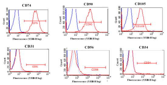 Flow cytometry analysis for isolated adipose-derived stem cells. Red curves PE-labeled against surface markers (CD74, CD90, CD105, CD31, CD56, CD34) antibodies. Blue curves, PE-labeled against IgG2a antibodies. Upper row, PE-labelled against CD74, CD90, and CD105 antibodies showing completely different curves from PE-labelled against IgG2a. Lower row, PE-labelled CD31, CD56, and CD34 antibodies showing curves nearly overlapping PE-labelled against IgG2a.