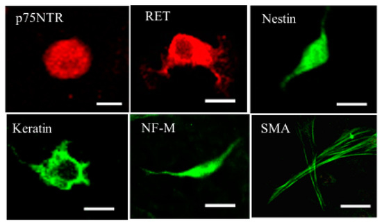 Immunostaining for naïve ADMSCs was performed by using anti- p75NTR (1:100; Sigma-Aldrich, St. Louis, MA, USA), anti-RET (1:100; LBSBio, Seattle, WA, USA), anti-nestin (1:200, Irvine, CA, USA), anti-keratin 15(1:200; LBSBio), anti-neurofilament-M (1:100; Chemicon, Temecula, CA, USA), and anti-smooth muscle actin (SMA; 1:200; Sigma-Aldrich) antibodies as the primary antibodies. The following secondary antibodies were used: rhodamine-conjugated anti-IgG (1:100; Sigma-Aldrich) or FITC-conjugated anti-IgG (1:100; Sigma-Aldrich). Observations were made with a fluorescence microscope system (FV300, Olympus, Tokyo, Japan).