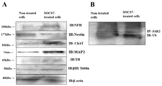 Immunoblotting (IB) and immunoprecipitation (IP) study on SOCS7-peptide-treated and non-treated cells. (A) Immunoblotting was done with anti-neurofilament-H (NFH), choline acetyl transferase (ChAT), nestin, choline acetylcholine transferase (ChAT), microtubule-associated protein 2 (MAP2), tyrosine hydroxylase (TH), and βⅢ-Tublin antibodies, anti-NFH antibody, anti-ChAT antibody, anti-TH antibody, and anti-actin antibody as an internal control. (B) Immunoprecipitation with anti-JAK2 antibody was followed by immunoblotting with anti-ubiquitin antibody.