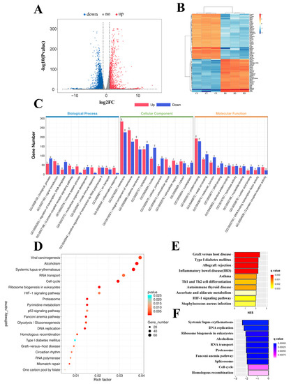 Whole-transcriptome sequencing assays were provided by Lianchuan Biotechnology (Hangzhou, China). Total RNA was isolated and purified using TRIzol reagent (Invitrogen, Carlsbad, CA, USA) following the manufacturer’s procedure. The RNA amount and purity of each sample were quantified using a NanoDrop ND-1000 (NanoDrop, Wilmington, DE, USA). Sequencing was performed on an Illumina HiSeq 4000 following the vendor’s recommended protocol. The following procedure for identification of DEGs was used: cutadapt was used to remove the reads that contained adaptor contamination, low-quality bases, and undetermined bases. The sequence quality was verified using FastQC (http://www.bioinformatics.babraham.ac.uk/projects/fastqc/), accessed on 1 May 2022. We used Bowtie2 and Hisat2 to map reads to the genome of species. The mapped reads of each sample were assembled using StringTie. Then, all transcriptomes from samples were merged to reconstruct a comprehensive transcriptome using perl scripts. After the final transcriptome was generated, StringTie and edgeR were used to estimate the expression levels of all transcripts. StringTie was used to perform expression level for mRNAs by calculating FPKM. The differentially expressed mRNAs were selected with log2 (fold change) >1 or log2 (fold change) < −1 and with statistical significance (p-value < 0.05) by R package–edgeR. The following procedure for identification of differentially expressed miRNAs was used: Raw reads were subjected to ACGT101-miR (v4.2, LC Sciences, Houston, TX, USA) removed adapter dimers, junk, low complexity, common RNA families, and repeats. Subsequently, unique sequences with length in 18~26 nucleotides were mapped to specific species precursors in miRBase 22.0 by BLAST search to identify known miRNAs and novel 3p- and 5p-derived miRNAs. Differential expression of miRNAs based on normalized deep-sequencing counts was analyzed by selectively using Student’s t-test. The significance threshold was set to be 0.01 and 0.05 in each test. To predict the genes targeted by most abundant miRNAs, two computational target prediction algorithms: TargetScan 5.0 (Whitehead Institute for Biomedical Research, Cambridge, MA, USA and Miranda 3.3a (Memorial Sloan-Kettering Cancer Center, New York, NY, USA) were used to identify miRNA binding sites. Finally, the data predicted by both algorithms were combined, and the overlaps were calculated. GO analysis was used for gene function annotation. KEGG analysis was used to determine the biological pathway.