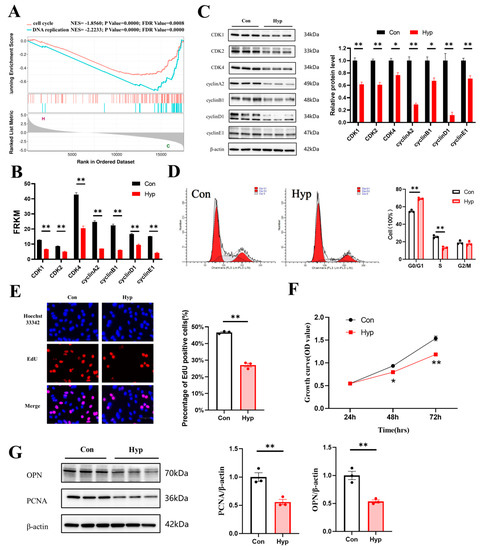Hypoxia inhibits microvascular endothelial cell cycle progression and cell proliferation. (A) GSEA curves of differentially expressed genes for the hypoxia vs. control comparison. (B) The expression of cyclin−dependent kinase 1(Cdk1), Cdk2, Cdk4, cyclin A2, cyclin B1, cyclin D1, and cyclin E1 from RNA−seq data. (C) Western blot analysis of CDK1, CDK2, CDK4, cyclin A2, cyclin B1, cyclin D1, and cyclin E1 (n = 3). (D) The percentages of cells in the G0/G1, S, and G2/M phases of the cell cycle were quantified by flow cytometry (n = 3). (E) The EdU (red) assay was used to examine cell proliferation (n = 3). EVOS M5000 objective magnification: 40×. (F) Cell proliferation was evaluated by a CCK−8 assay (n = 3). (G) Proliferating cell nuclear antigen (PCNA) and osteopontin (OPN) expression was determined by Western blotting (n = 3). Data are shown as the mean ± SEM, * p < 0.05, ** p < 0.01. Hyp indicates hypoxia, and Con indicates control.