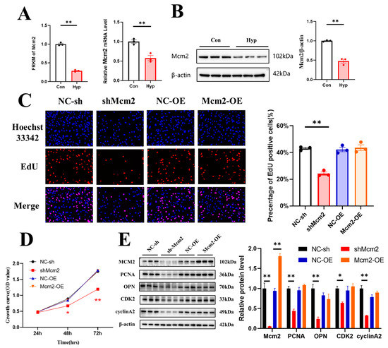 Knockdown of Minichromosome maintenance complex component 2 (Mcm2) inhibits cell cycle progression and cell proliferation. (A) The expression of Mcm2 from RNA-seq data and qRT–PCR (n = 3). (B) MCM2 expression was determined by Western blotting (n = 3). (C) The EdU (red) assay was used to examine cell proliferation (n = 3). EVOS M5000 objective magnification: 20×. (D) Cell proliferation was evaluated by a CCK-8 assay (n = 3). The symbol * (red) represents the shMcm2 vs. NC-sh group. (E) Western blot analysis of MCM2, PCNA, OPN, CDK2 and cyclin A2 (n = 3). Data are shown as the mean ± SEM, * p < 0.05, ** p < 0.01. NC indicates negative control, and OE indicates overexpression.