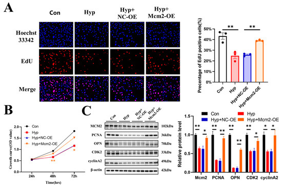 MCM2 attenuates the inhibition of cell cycle progression and cell proliferation caused by hypoxia. (A) The EdU (red) assay was used to examine cell proliferation (n = 3). EVOS M5000 objective magnification: 20×. (B) Cell proliferation was evaluated by a CCK-8 assay (n = 3). The symbol * (orange) represents the Hyp + Mcm2-OE vs. Hyp + NC-OE group. (C) Western blot analysis of Mcm2, PCNA, OPN, CDK2, and cyclin A2 (n = 3). Data are shown as the mean ± SEM, * p < 0.05, ** p < 0.01.