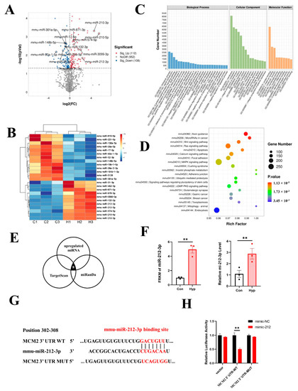 The whole-transcriptome sequencing assay showed that 112 miRNAs were significantly upregulated, and 108 miRNAs were significantly downregulated (p < 0.05) in bEnd.3 cells exposed to hypoxia (Supplementary Table S2). A volcano map and a heatmap were generated to visualize the top upregulated and downregulated miRNAs (Figure 5A,B). GO and KEGG enrichment analyses of the total target genes for differentially expressed miRNAs under hypoxic conditions were performed (Figure 5C,D). Then, we predicted the upstream miRNAs of MCM2 through TargetScan and miRanDa. The Venn diagram showed that eight of one-hundred and twelve significantly upregulated miRNAs targeted MCM2 (Figure 5E). Considering the expression levels and fold changes of these miRNAs, we chose miR-212-3p, which was the most significantly upregulated miRNA with high expression levels. RNA-seq and qRT–PCR showed that miR-212-3p expression was significantly increased under hypoxia compared with the control condition (p < 0.01) (Figure 5F). The activity of the MCM2 3′-UTR luciferase reporter sharply decreased after treatment with the miR-212-3p mimic by dual luciferase assay (p < 0.01), but no significant changes were found in mutated MCM2 3′-UTR after the same treatment, suggesting that MCM2 was a direct target of miR-212-3p (Figure 5G,H).
