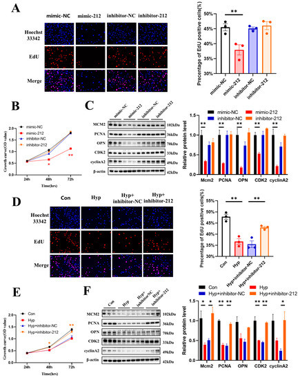 miR-212-3p inhibitor attenuates the inhibition of cell cycle progression and cell proliferation caused by hypoxia. (A) The EdU (red) assay was used to examine cell proliferation (n = 3). EVOS M5000 objective magnification: 20×. (B) Cell proliferation was evaluated by a CCK-8 assay (n = 3). The symbol * (red) represents the mimic-212 vs. mimic-NC group. (C) Western blot analysis of MCM2, PCNA, OPN, CDK2, and cyclin A2 (n = 3). (D) The EdU (red) assay was used to examine cell proliferation (n = 3). EVOS M5000 objective magnification: 20×. (E) Cell proliferation was evaluated by a CCK-8 assay (n = 3). The symbol * (orange) represents Hyp + inhibitor-NC vs. Hyp + inhibitor-212. (F) Western blot analysis of MCM2, PCNA, OPN, CDK2, and cyclin A2 (n = 3). Data are shown as the mean ± SEM, * p < 0.05, ** p < 0.01.