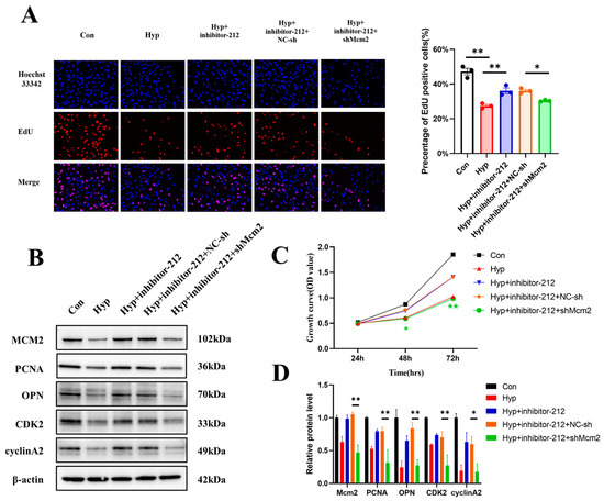 miR-212-3p attenuated hypoxia-induced cell cycle progression and cell proliferation inhibition by regulating MCM2. (A) The EdU (red) assay was used to examine cell proliferation (n = 3). EVOS M5000 objective magnification: 20×. (B,D) Western blot analysis of MCM2, PCNA, OPN, CDK2, and cyclin A2 (n = 3). (C) Cell proliferation was evaluated by a CCK-8 assay (n = 3). The symbol * (green) represents Hyp + inhibitor-212 + shMcm2 vs. Hyp + inhibitor-212 + NC-sh. Data are shown as the mean ± SEM, * p < 0.05, ** p < 0.01.