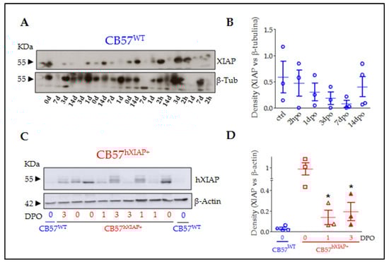 As shown before [,,,], the Thy 1.2 expression cassette drives the overexpression of hXIAP in neurons in different parts of the CNS such as the hippocampus, the cortex, the striatum, and the spinal cord. To confirm that the construction induces hXIAP overexpression in the spinal cord and to analyse its changes after SCI, we carried out an immunoblot using a monoclonal antibody against hXIAP without known reactivity against mouse XIAP in spinal cord protein samples from sham (0 days post-operation (0 dpo)) and SCI (1 and 3 dpo) CB57hXIAP+ mice and from 0 dpo CB57WT control mice (Figure 1C,D). As expected, hXIAP was highly expressed in the spinal cord of CB57hXIAP+ mice and absent in CB57WT. After SCI, hXIAP expression in transgenic mice became significantly reduced, although remained detectable (difference vs. sham CB57hXIAP+ mice according to Student’s t-test: 1 dpo: T4 = 2.84, p-value = 0.02; 3 dpo: T5 = 2.59, p-value = 0.03; n = 3 animals/group).
