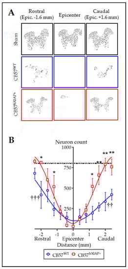 Spinal cord sections from CB57WT and CB57hXIAP+ mice labelled for the NeuN neuronal marker were used to quantify the number of neurons surviving after injury. Estimates of the number of neurons in slices 4.8 mm around the injury epicentre showed that overexpression of hXIAP in spinal neurons from CB57hXIAP+ mice had neuroprotective effects (Figure 2A). These analyses revealed that at 21 dpo, virtually all neurons had disappeared within the 400 µm surrounding the injury epicenter in both CB57WT and CB57hXIAP animals (number of neurons in CB57WT mice = 36.3 ± 35.1 vs. sham = 800 ± 39 and in CB57hXIAP+ mice = 32.75 ± 15.6 vs. sham = 807.7 ± 72.1). In CB57WT mice, sections at 2 mm rostral and caudal to the epicentre retained about 50% of neurons observed in sham mice (2 mm caudal: 51.21 ± 10.17% reduction, T6 = 5.24, p-value = 0.001; 2 mm rostral: 43.32 ± 23.82% reduction, T7 = 3.93, p-value = 0.003; n = 3–6 animals/group). Conversely, neuronal loss was reduced in CB57hXIAP+ mice in sections 1 to 2 mm at both rostral and caudal directions compared with CB57WT mice, reaching similar counts as in sham conditions (2 mm caudal: 27.49 ± 18.86% reduction in the number of neurons relative to sham CB57hXIAP+; T6 = 4.08, p-value = 0.003; n = 3–6 animals/group; 2 mm rostral: only a 21.02 ± 10.73% reduction; T3 = 3.23, p-value = 0.02).