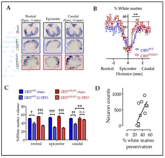 Reduction in histological damage at 21 dpo by hXIAP overexpression in CB57hXIAP mice. (A) Representative images of spinal cord sections from sham (black), 21 dpo injured CB57WT mice (blue), and CB57hXIAP+ 21 dpo injured mice (red). (B) Estimations of the percentage of preserved white matter in transverse sections comprising 3 mm surrounding the injury epicentre of the spinal cord show that CB57hXIAP+ mice (red symbols) slices have a significant increase in spared tissue area in sections caudal to the injury epicentre compared with CB57WT mice (blue symbols) (symbols represent mean ± SEM; ** = p-value < 0.01 in Student’s t-test vs. CB57WT mice.; n = 4–6 animals/group). (C) Estimations of the volume of spared white matter in cylinders 300 µm-long centred at the injury epicentre, as well as caudal and rostral to this region, also reveal a protective effect of hXIAP overexpression (red bars) in the region caudal to the injury zone in comparison with WT mice (blue bars) (bars represent means ± SEM; † = p-value < 0.05, †† = p-value < 0.01, ††† = p-value < 0.001 vs. their correspondent sham samples for each mouse strand; ** = p-value < 0.01, in Student’s t-test, n = 4–6 animals/group). (D) Dot-plot correlating preserved white matter volumes with the corresponding neuron counts for each section (Figure 2) at the SCI epicentre and at both caudal and rostral directions of transgenic and WT mice altogether. Pearson correlation coefficient = 0.6, p-value = 0.012.