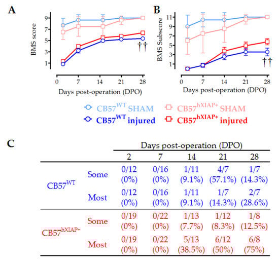 As illustrated in Figure 4B, the BMS subscore emphasised the differences between the CB57WT animals (mean subscore 3.6 ± 0.7 at 21 dpo (n = 8) and 3.6 ± 0.8 at 28 dpo (n = 12)) and CB57hXIAP+ mice (4.9 ± 0.8 points at 21 dpo (n = 12) and 5.8 ± 0.6 at 28 dpo (n = 12)), (F1 = 8.5; p-value = 0.01 for genetic background effect in a two-way ANOVA). Differences were particularly obvious in the capacity of mice to carry out a coordinative walk between forelimbs and hindlimbs. An individualised analysis revealed that a higher number of CB57hXIAP+ mice recovered a mostly coordinated locomotion compared with CB57WT mice (75% (six of eight animals) vs. 28% (two of seven) at 28 dpo, respectively; Chisquare1 = 3.23, p-value = 0.07; n = 7–8 animals/group) (Figure 4C).