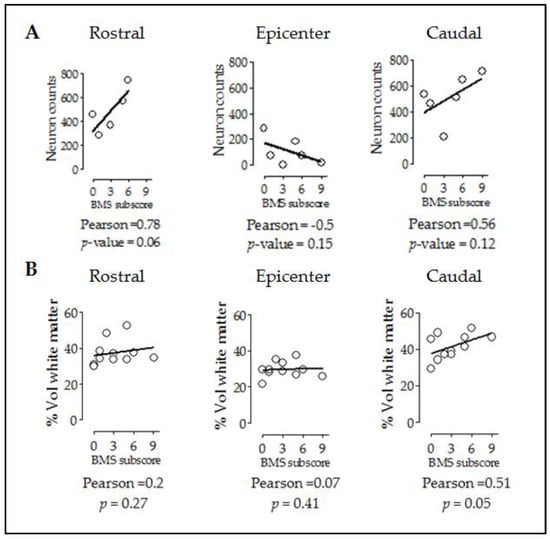 As shown before with the relationship between tissue preservation and cell counts, we evaluated whether the improved motor performance observed in injured CB57hXIAP+ correlates with the improvements at tissue and cellular levels. Firstly, a correlation analysis showed that motor function recovery (BMS subscore) had a good correlation with neuron counts in rostral and caudal sections (Figure 5A) (epicenter: PCC = −0.5, p-value = 0.15; rostral: PCC = 0.78, p-value = 0.06; caudal: PCC = 0.56, p-value = 0.12).