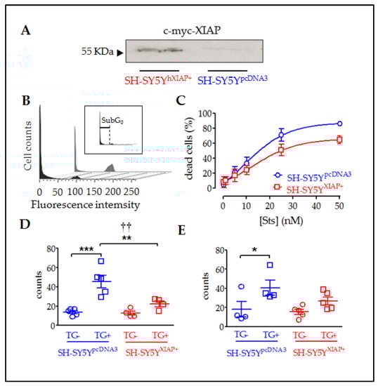 Reduction in cell death in SH-SY5Y cultures overexpressing XIAP. (A) Immunoblot showing the overexpression of c-myc-XIAP fusion protein in homogenates obtained from SH-SY5YpcDNA3 and SH-SY5YXIAP+ cells. (B) Representative flow cytometry histograms of DAPI-stained SH-SY5Y cell cycle under Sts stimulation. The black profile corresponds to SH-SY5YWT-treated control cultures and the grey profile to SH-SY5YXIAP+-treated cells. Insert in B shows the sub-Go region (apoptotic cells with condensed nuclei) of the cell cycle used to evaluate the percentage of cell death in the population. (C) Dose–response of the percentages of apoptotic cells in the SH-SY5YWT (blue symbols) and SH-SY5YXIAP+ (red symbols) cell cultures after treatment with increasing concentrations of Sts (symbols represent the mean ± SEM and lines the Michaelis–Menten non-linear fit of the data; ** = p-value < 0.01 in paired Student’s t-test; † = p-value < 0.05 in two-way ANOVA of genetic background effect). Early apoptotic death was measured through annexin V staining (D) and late cell death was measured by DAPI staining (E) after TG treatment in SH-SY5YpcDNA3 (blue symbols) and SH-SY5YXIAP+ (red symbols) cell cultures (dot plots represent mean ± SEM; *** = p-value < 0.001, ** = p-value < 0.01, and * = p-value < 0.05 in non-paired Student’s t-test. †† = p-value = 0.01 in two-way ANOVA of genetic background effect; n = 4–5 independent experiments).