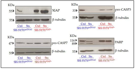 Expression levels of different apoptotic-related proteins in SH-SY5Y cells after Sts treatment. Representative immunoblots of XIAP, pro-CASP3, PARP, and pro-CASP7 and loading control β-tubulin proteins expression in SH-SY5YpcDNA3 and SH-SY5YXIAP+ cell line lysates before and after treatment with Sts (25 nM for 24 h).
