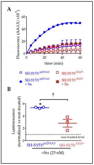 Reduction in Sts-induced activation of CASP3/7 by overexpression of XIAP in SH-SY5Y cells. (A) Kinetics of CASP3/7 activity in both SH-SY5YpcDNA3 (blue symbols) and SH-SY5YXIAP+ cells (red symbols), treated at time 0 with Sts (filled symbols) or vehicle (empty symbols). (B) The dot plot summarises the Sts effect in CASP3/7 activity for SH-SY5YpcDNA3 (blue symbols) and SH-SY5YXIAP+ cells (red symbols). Data were normalised by non-treated levels (dot line) after 30 min (dot plot represents means ± SEM; * = p-value < 0.05 in paired Student’s t-test for Sts-treated SH-SY5YpcDNA3 vs. vehicle-treated cells; † = p-value < 0.05 in a two-way ANOVA of genetic background effect; n = 3 independent experiments).