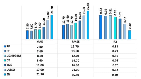 Nonlinear regression models (RF and ET) outperform linear models (LASSO and EN) because they exhibit more parameters (properties of training data learned during the learning process). RF is excellent at processing categorical, binary and numeric features, making it ideal for working with high-dimensional data with minimal pre-processing requirements.