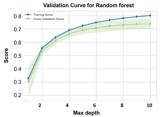 Figure 2 presents the validation curve of the RF algorithm derived from the internal validation dataset (70%), the values of the training and cross-validation score are close, indicating the model goodness of fit and robustness of the training model.