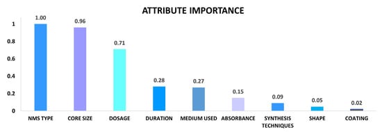 The duration of exposure, the medium used and the absorbance are relatively important attributes that affect the prediction. The synthesis techniques, shape and coating (presence or absence) have relatively less effect on the prediction.