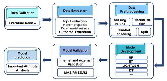 Figure 5 depicts an overview of the workflow followed. First, a literature review of studies investigating the efficiency of NMs via in vitro experiments was performed. P-chem properties of NMs, exposure conditions, measurement equipment-related features, characterization methodologies and assays used for assessing the anti-ox efficiency were extracted. Following an investigation of the dataset’s completeness, data pre-processing was carried out, including normalization [66], one-hot encoding [67] and data split [68]. Several regression models were trained and validated using a variety of performance parameters in order to identify a model with high predictability. To train ML models, we used Scikit-learn and PyCaret library [69]. Finally, importance attribute analysis, a supervised technique that identifies and ranks the variables was used [70].