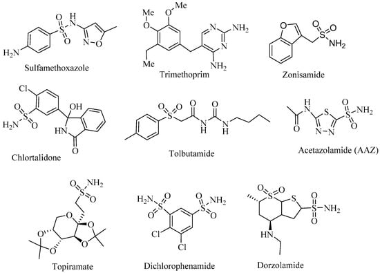 There are many drugs on the market incorporating a sulfonamide moiety. Some examples are: the antibiotics sulfamethoxazole (used as cotrimoxazole in combination with trimethoprim), chlortalidone a thiazide-like diuretic, tolbutamide –potassium channel blocker used as oral hypoglycemic medication, zonisamide, a drug for the treatment of epilepsy and Parkinson disease, as well as acetazolamide, carbonic anhydrase inhibitor, topiramate, a sulfamate drug used also to treat epilepsy and migraine, dichlorophenamide, carbonic anhydrase inhibitor used to treat acute angle closure glaucoma, dorzolamide, used to treat high pressure inside the eye, including in cases of glaucoma, and many others [44], (Figure 1).