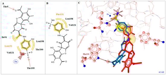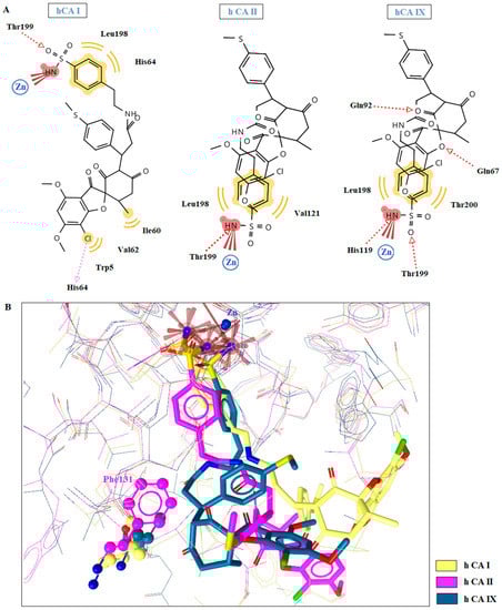 In particular, in all isoform structures, the negative nitrogen of the sulphonamide group chelates the Zn (II) ion and forms hydrogen bonds (Figure 3A). In all isoforms, the one oxygen atom of the sulphonamide group forms a hydrogen bond with residue Thr199. Furthermore, in isoform hCA I, the Cl atom of the benzene ring is forming a halogen bond with residue His64. Additionally, the benzene ring is interacting hydrophobically with Val121 and Leu198 (Figure 3A). In isoform hCA IX there are except the aforementioned H-bond with residue Thr199, another three hydrogen bonds formed with residues His119, Gln67, and Gln92. These interactions can probably explain the high ki value of compound 1i against all isoforms and especially its superiority over AAZ in isoform hCA IX. The same conclusion can be made and for compounds 1h and 1j with a similar structure to compound 1i.