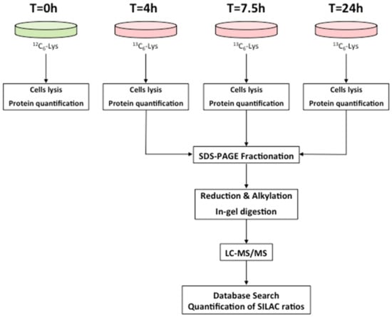 Proteomics workflow used to estimate turnover rates of individual proteins. Cells were grown in the SILAC heavy medium and collected at 4, 7.5, and 24 h. Following cell lysis and protein quantification, a fractionation step by SDS-PAGE was performed, and proteins were then digested and analyzed by LC-MS/MS as detailed in Section 4.