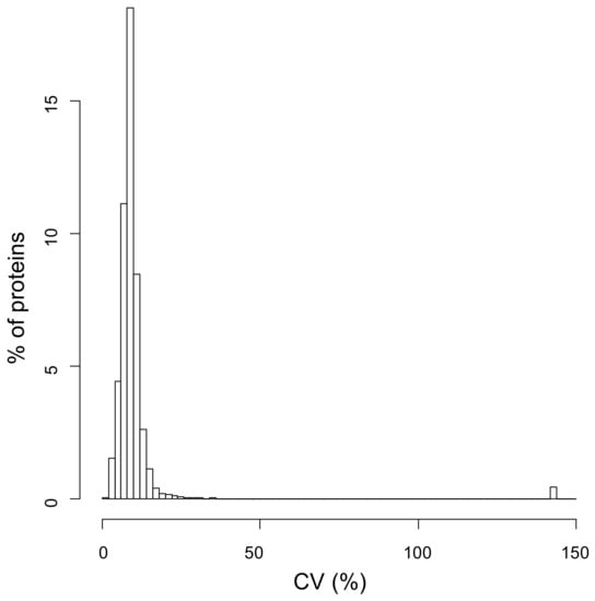 From the distribution plot, it is clear that for a vast majority of proteins, the parameter k was estimated with very good precision, i.e., with a CV lower than 15%. A total of 1642 different proteins across all subjects (on average, 935 proteins for each subject, with a standard deviation SD equal to 119) showed a CV of the parameter estimate lower than 50% and were retained for further analysis (Table S2).