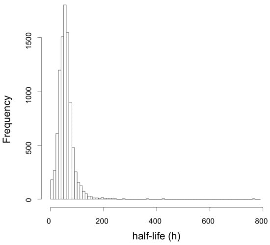 Figure 4 shows the average half-life distribution of the 1642 analyzed proteins, where the half-life T1/2 is computed as log2/k. Considering only the proteins for which a reliable estimate of k could be obtained in at least 2 out of 10 samples (in total 1338 proteins), the distribution of the mean values of T1/2 ranges between 3 and 573 h, being on average equal to 59.9 h (Table S3). Note that the protein with the highest T1/2 is keratin 5, probably a contaminant protein that could be filtered out of the dataset. In this case, the highest T1/2 would be 477 h.