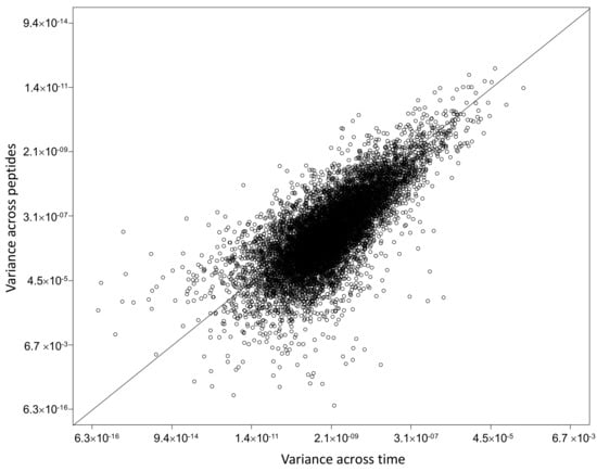 Protein abundance relative quantification was performed on a total of 2226 different proteins across 10 subjects (Table S5). To note that protein half-life could be reliably assessed for 1664 proteins, since for the estimate of k we decided to use data associated with proteins identified at least at two temporal points, one of which was set to be 24 h. This limitation does not apply for the estimate of protein abundance, which therefore led to the quantification of a higher number of proteins. Abundance levels in the three time points indirectly confirmed the steady state hypothesis. Indeed, for each protein, the variance across different time points tends to be equal to or lower than the technical variation, measured as the variance observed across peptides matching the same protein in the same sample (Figure 5). Here it is clear that protein abundance does not significantly vary across the three time points, thus indicating that a steady state can be confidently assumed.