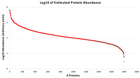 Distribution of protein abundances. The average protein abundance estimated for the entire protein set is shown in a logarithmic scale (Arbitrary Units) and spans 4 orders of magnitude.