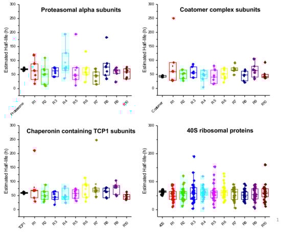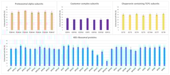 To further confirm, as already reported by others [13,117], that proteins involved in common biological processes tend to have similar turnover rates, we compared the half-lives of a number of proteins that are subunits of specific, well-characterized macromolecular complexes. Some examples of this analysis are reported in Figure 8, where the half-lives of proteasomal alpha subunits, subunits of the coatomer and of the chaperone protein TCP1 complex, and ribosomal subunits of the 40S complex are shown.