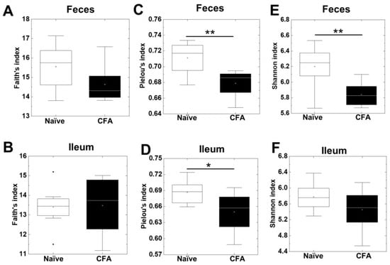 We conducted alpha diversity analyses of the microbiome between the naïve and CFA-injected groups and between the ileal and fecal samples, using QIIME 2 []. We used the Faith’s phylogenetic diversity index for bacterial richness, Pielou’s evenness index for bacterial evenness, and Shannon index for the combination of both [].