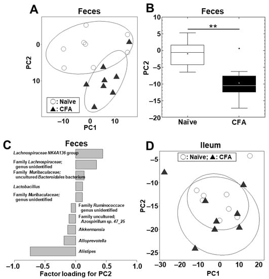 Principal component analysis (PCA) of the ileal and fecal microbiome data at the genus level between the naïve (○) and CFA-injected (▲) groups. We conducted PCA using the fecal (A–C) and ileal samples (D). Ellipses indicate an 80% confidence interval of each group. (A,B) In feces, PC2 values were statistically different between the two groups (**, p < 0.01, Student’s t test). (C) Factor loading for PC2 showed that the relative abundances of the genera Lachnospiraceae NK4A136 group and Alistipes contributed positively and negatively to the PC2 distribution, respectively. (D) In the ileum, PCA did not separate the two groups. Each group was composed of eight mice.