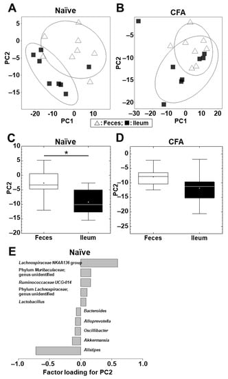 PCA of the microbiome data between the ileum (■) and feces (△) at the genus level in the naïve (A) and CFA-injected (B) groups. Ellipses indicate an 80% confidence interval of each group. PCA separated the ileum samples from the fecal samples by PC2 in the naïve group (C) (*, p < 0.05, Student’s t test), but not in the CFA-injected group (p = 0.11) (D). (E) Factor loading for PC2 showed that the relative abundances of the genera Lachnospiraceae NK4A136 group and Alistipes contributed positively and negatively to the PC2 distribution, respectively, in the naïve group. Each group was composed of eight mice.