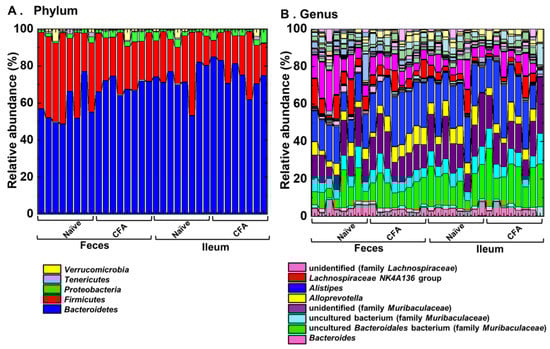 The bacterial compositions and diversities have been shown to differ between the ileum and feces. For example, Gu et al. showed the highest diversities in the cecum, colon, and feces, and the lowest diversities in the jejunum and ileum along the mouse gastrointestinal tract []. In this study, we found higher alpha diversities in feces than in the ileum in the naïve group, but not in the CFA-injected group (Supplemental Figure S1). Similarly, when we compared the numbers of bacterial phyla and genera having statistical differences in the bacterial abundances between the ileum and feces, these numbers were higher in the naïve group than in the CFA-injected group (Supplemental Tables S1 and S2). Thus, adjuvant injections seemed to decrease the bacterial diversities between the ileum and feces.