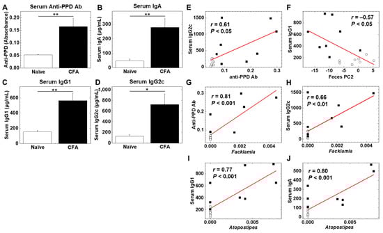 (A–D) Levels of serum antibody (Ab) against purified protein derivative (PPD) of Mycobacterium tuberculosis, a component of CFA, and immunoglobulin isotypes (IgA, IgG1, and IgG2c) in the CFA-treated and naïve groups. Serum anti-PPD Ab (A), IgA (B), IgG1 (C), and IgG2c (D) were quantified by enzyme-linked immunosorbent assays (ELISAs). In the CFA-injected group, levels of anti-PPD Ab, IgA, IgG1, and IgG2C were higher than the naïve group (*, p < 0.05; **, p < 0.01 Student’s t test). Values are the mean + standard error (SE). (E,F) Correlation analyses between serum IgG2c and anti-PPD Ab (E), and serum IgG1 and fecal PC2 values (F) (○, naïve; ■, CFA). (G–J) Pattern matching between Ab levels and relative abundance of ileal bacteria: anti-PPD Ab and the genus Facklamia (G), serum IgG2c and the genus Facklamia (H), serum IgG1 and the genus Atopostipes (I), serum IgA and the genus Atopostipes (J) (○, naïve; ■, CFA).