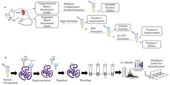 In the current study, we applied these two ECM extraction methods (Figure 1a) to explore the matrisome of kidneys in healthy adult mice with an overall goal of creating a reference database for future renal research. This work was particularly motivated by the fact that, now, information on the matrisome composition of mouse kidneys is very limited and incomplete. While mouse models are crucial for studies of renal morphogenesis and diseases [24], chronic kidney disease (CKD) [25], as well as for drug and biomarker discovery [26,27], only two recent studies are currently available on the identification of ECM proteins in the insoluble tissue fractions of mouse kidney extracts [20,28]. Importantly, the methodology applied in these studies did not allow the identification of loosely bound ECM proteins, which suggests incomplete characterization of the matrisome. Moreover, quantification of ECM proteins in mouse kidneys has yet to be achieved.