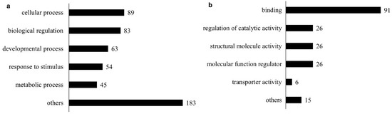The top five GO-enriched terms for molecular function of identified proteins revealed the “binding (GO:0005515)” proteins, which interact with other molecules via a specific site, as a leading category. This was followed by “regulation of catalytic activity (GO:0050790)”, “structural molecule activity” (GO:0005198), “molecular function regulator” (GO:0098772), “transporter activity” (GO:0005215) and others including signaling receptor activity, transcription coregulators, scavenger receptor activity, antioxidant activity, ATPase activity, translation activator activity and protein–macromolecule adaptors (Figure 3b).