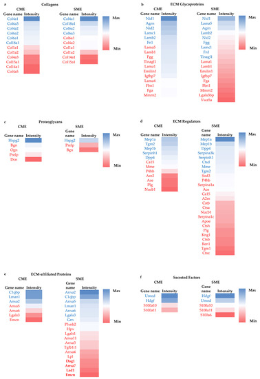 Heatmap of abundance of quantifiable matrisome proteins in the products of the CME and SME methods of sample preparation. Color coding in the heatmap depicts the variation between the maximum (coded in blue tones) to minimum (coded in red tones) observed LFQ intensity for each matrisome category and protein extraction method. The protein names shown by blue and red fonts are expressed above and below the average LFQ values in each matrisome category, respectively. The color coding scales (from blue for maximum LFQ intensity to red for minimum intensity per category) are provided on side of heatmaps (a–f).