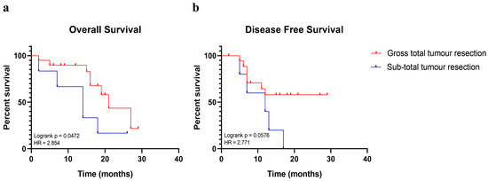 Kaplan–Meier curves performed on patients enrolled in the study. Survival analysis displays the estimated survival of patients who either received a gross total tumour resection during surgery (in red) or who received a sub-total one (in blue). Timing is expressed in months. (a) Shows the effects of the gross total tumour resection on the overall survival. (b) Shows the effects of the gross total tumour resection on the disease-free survival. Log-rank p values and hazard ratio (HR) are reported.