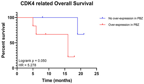 In order to evaluate the potential role of the selected genes in the malignant transformation of the PBZ, the expression levels of CDK4 and EXT2 in both the studied cohort and in the databases’ cohorts were correlated to survival analysis. Since in the current cohort, four patients had CDK4 lower expressed in PBZ than in the normal control and in six patients it was vice versa, to determine whether the CDK4 higher expression might be an index of malignant transformation of this area and therefore be a negative prognostic marker, survival analysis was performed comparing the two groups. An increased expression of CDK4 in the peritumoural margin of GBM seemed to reduce the overall survival of these patients, as observed in Figure 3 (hazard ratio: 5.278, confident interval: 0.8991 to 30.99, p = 0.050). Regarding EXT2, most of the patients (90%) had higher expression in the PBZ than in the normal control (Figure 2), thus it was not possible to classify them into two groups and survival analysis was not performed.
